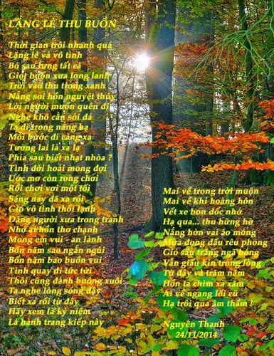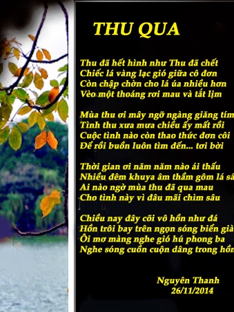 THU QUA Thu đã hết hình như Thu đã chết Chiếc lá vàng lạc gió giữa cô đơn Còn chập chờn cho lá úa nhiều hơn Vèo một thoáng rơi mau và tắt lịm Mùa thu ơi mây ngỡ ngàng giăng tím Tình thu xưa mưa chiều ấy mất rồi Cuộc tình nào còn thao thức đơn côi Để rồi buồn luôn tìm đến... tơi bời Thời gian ơi năm năm nào ái thấu Nhiều đêm khuya âm thầm gôm lá sầu Ai nào ngờ mùa thu đã qua mau Cho tình này vì đâu mãi chìm sâu Chiều nay đây cõi vô hồn như đá Hồn trôi bay trên ngọn sóng biển già Ôi mơ màng nghe gió hú phong ba Nghe sóng cuồn cuộn dâng trong hồn ta Nguyên Thanh 26/11/2014