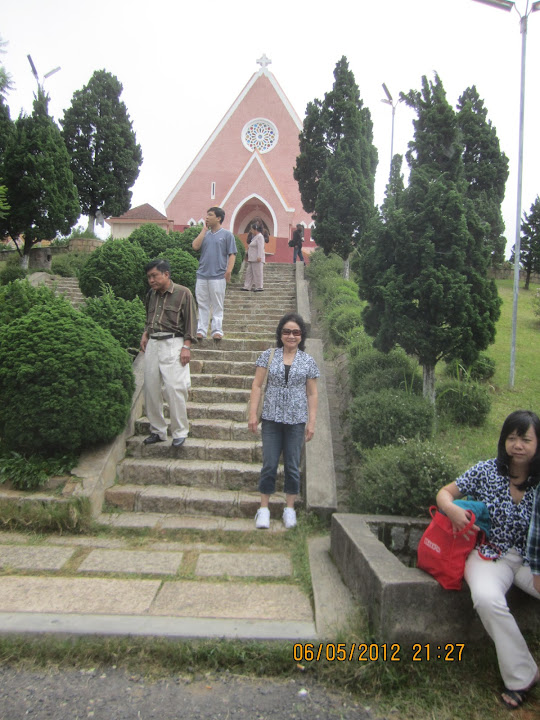 Sau khi ăn sáng trên tầng thượng của khách sạn xong, còn dư thời giờ đợi bộ phận còn lại ngụ nơi khác đến, chúng tôi tranh thủ ra sân của tầng nầy chụp hình và ngắm toàn cảnh Đà Lat ... Khách sạn ở vị trí khá gần nhìn được toàn cảnh hồ Xuân Hương và những vùng mở rộng hai bên trái phải so với hồ nầy ... Nói chung như tôi là người lần đầu đến đây, phải công tâm mà nói Đà Lạt cũng chấp nhận được về vệ sinh đường phố, về cảnh quang tươi mát, về lịch sự của người buôn bán, phục vụ, những khu thăm viếng di tích có bảo tri, tu bổ, chăm sóc .... Nếu có dịp lưu ngụ thời gian dài biết đâu sẽ còn những khám phá mới Nơi đầu tiên trong ngày chúng tôi đến viếng nhà thờ .... Ngôi giáo đường không lớn nhưng có những cơ sở sản xuất từ thức ăn bánh kẹo đến hàng mỹ nghệ bán cho khách du lịch .... HDV có kể lan man về nhiều thứ chung quanh ngôi giáo đường nầy ... nhưng tôi không mặn mòi với những câu chuyện như thế nên phút chốc lãng quên ngay . Chúng tôi chụp hình chung toàn đoàn ngay bậc thang lên giáo đường, riêng tư lịnh tôi còn chụp được ảnh nơi hang đá và sau đó mỗi gia đình được cấp cho một hoặc vài tấm đã chụp chung tuỳ ít hay đông . Và chúng tôi lại lên xe di chuyển .