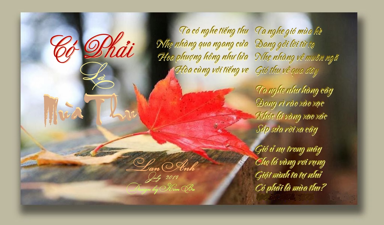 Lâu rồi không thơ cùng o Lan Anh, hôm nay nhị tôi vào mượn ý thơ o mà vần âm nghe. Có Phải Là Mùa Thu Tai nghe tiếng hạ gió mùa qua Tiết đổi heo may lộng lối nhà Đỏ cánh phong hàng cong cạnh bến Vàng thân cỏ lớp thẳng đồng xa Tơ lờ lững rụng chiều mơ tóc Khói mịt mù bay tối mộng tà Nguyệt chiếu song làn lay tỉnh giấc Tai nghe tiếng hạ gió mùa qua Chắc vậy...bên này trời cũng sắp vào thu rồi đấy o Lan Anh ạ. Thân, Nhị
