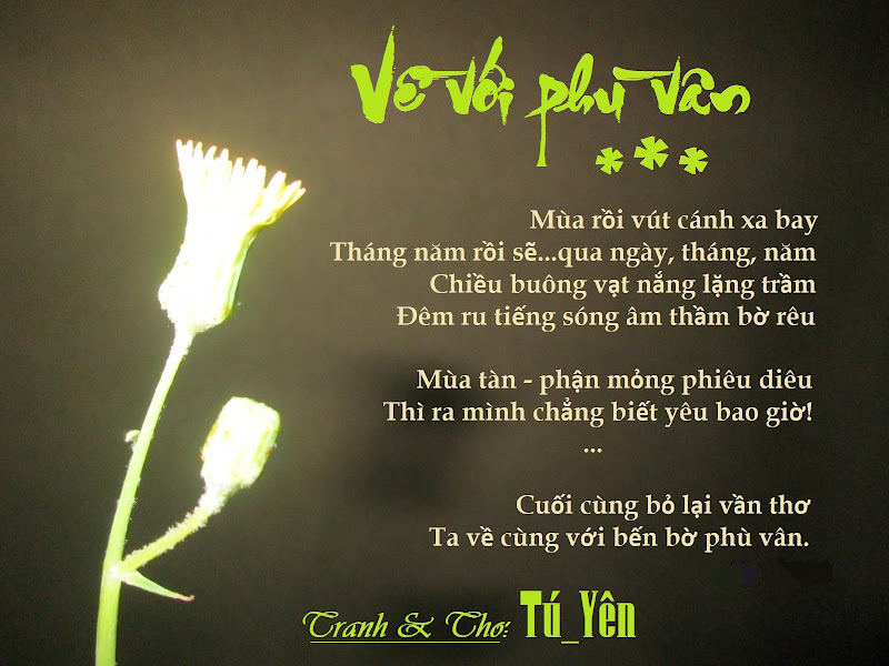 Về với phù vân Mùa rồi vút cánh xa bay Tháng năm rồi sẽ…qua ngày, tháng, năm Chiều buông vạt nắng lặng trầm Đêm ru tiếng sóng âm thầm bờ rêu. Mùa tàn – phận mỏng phiêu diêu Thì ra mình chẳng biết yêu bao giờ! … Cuối cùng bỏ lại vần thơ Ta về cùng với bến bờ phù vân. Tú_Yên (05-09-2020)
