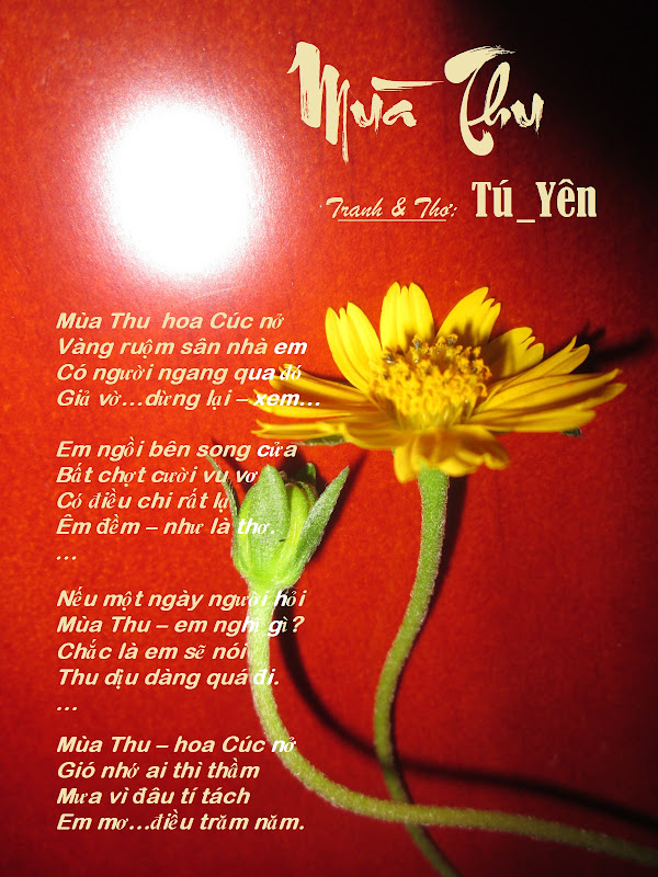 Mùa Thu Mùa Thu hoa Cúc nở Vàng ruộm sân nhà em Có người ngang qua đó Giả vờ...dừng lại – xem... Em ngồi bên song cửa Bất chợt cười vu vơ Có điều chi rất lạ Êm đềm – như là thơ. Nếu một ngày người hỏi Mùa Thu – em nghĩ gì? Chắc là em sẽ nói Thu dịu dàng quá đi. ... Mùa Thu – hoa Cúc nở Gió nhớ ai thì thầm Mưa vì đâu tí tách Em mơ...điều trăm năm. Tú_Yên (27-09-2020) R