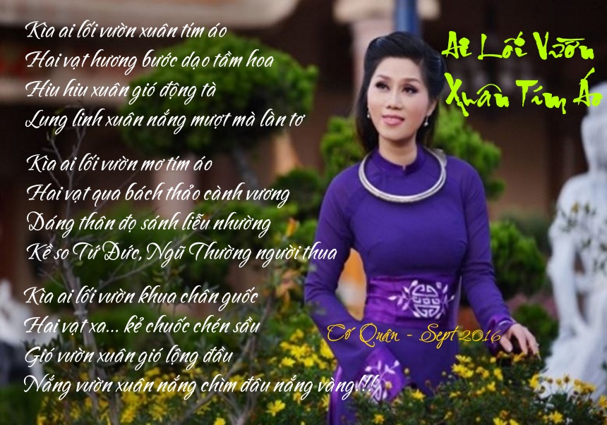 Ai Lối Vườn Xuân Tím Áo Kìa ai lối vườn xuân tím áo Hai vạt hương bước dạo tầm hoa Hiu hiu xuân gió động tà Lung linh xuân nắng mượt mà làn tơ Kìa ai lối vườn mơ tím áo Hai vạt qua bách thảo cành vương Dáng thân đọ sánh liễu nhường Kề so Tứ Đức, Ngũ Thường người thua Kìa ai lối vườn khua chân guốc Hai vạt xa...kẻ chuốc chén sầu Gió vườn xuân gió lộng đầu Nắng vườn xuân nắng chìm đâu nắng vàng!!! Cố Quận