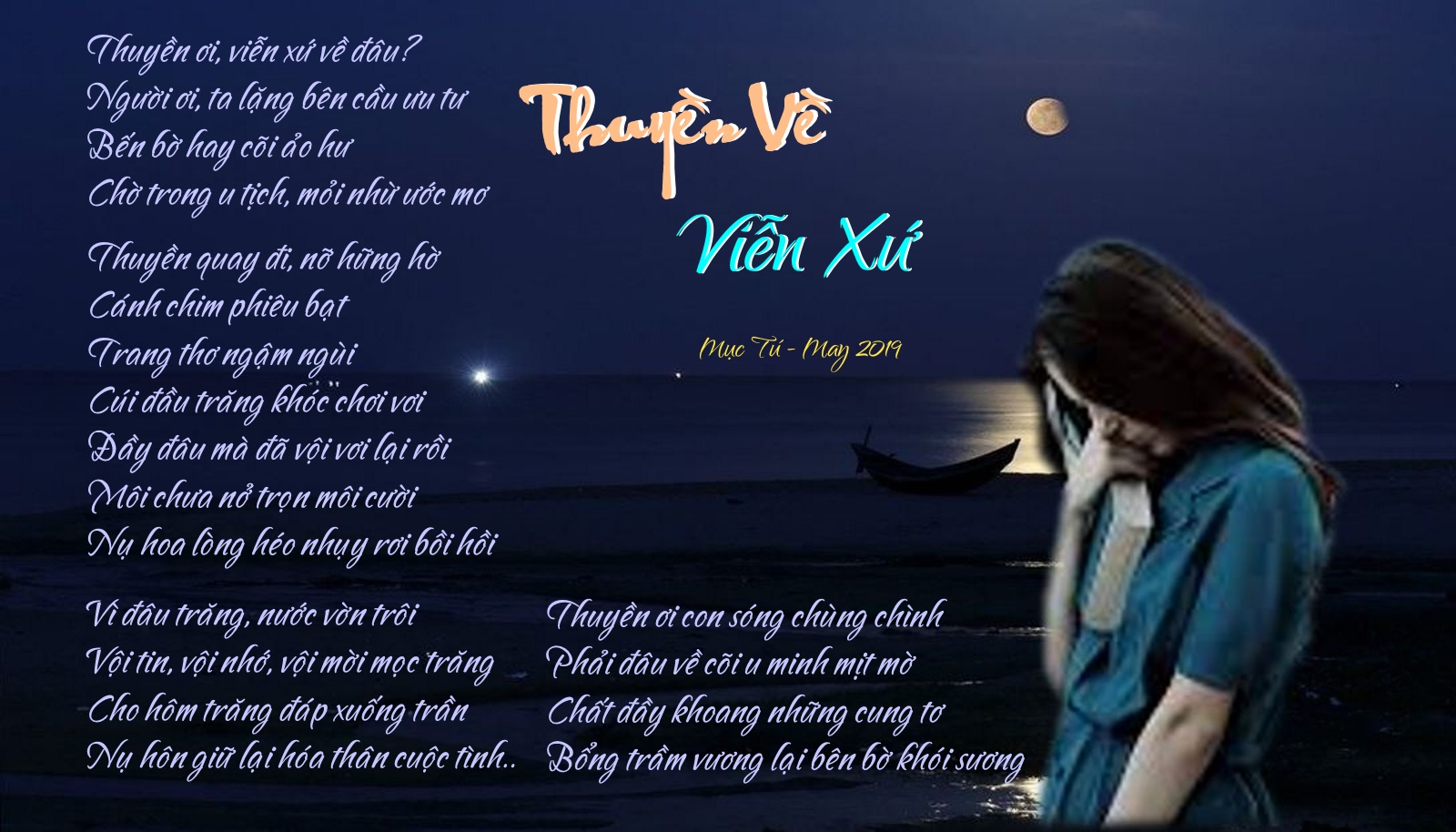 Mai Thuyền Viễn Xứ! Kiếp Tha Hương Mai thuyền viễn xứ! Kiếp tha hương Đất mẹ lìa xa luống đoạn trường Tám hướng mây quần vây tĩnh mịch Mười phương gió nổi hốt thê lương Bờ nam tiểu điểu đuôi đưa ngõ Bể bắc kình ngư mũi dắt đường Đất mẹ đêm nằm mong dỗ giấc Mai thuyền viễn xứ! Kiếp tha hương Cố Quận
