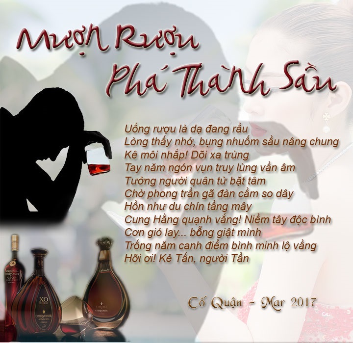Mượn Rượu Phá Thành Sầu (2) Xuân mượn rượu phá thành sầu đất khách Niềm ly hương xa cách quá quê nhà Bên đây bờ dõi bến ấy trùng xa Đàn em nhỏ! Mẹ cha già âm bóng Xuân mượn rượu phá thành sầu mắt đọng Lệ giọt lăn! Nghẹn giọng thốt tết ơi Đâu sắc hoa mai...đâu khói tơ trời Đâu đường quanh xóm một thời đỏ pháo Cố Quận Đêm mượn rượu phá thành sầu xuân đáo