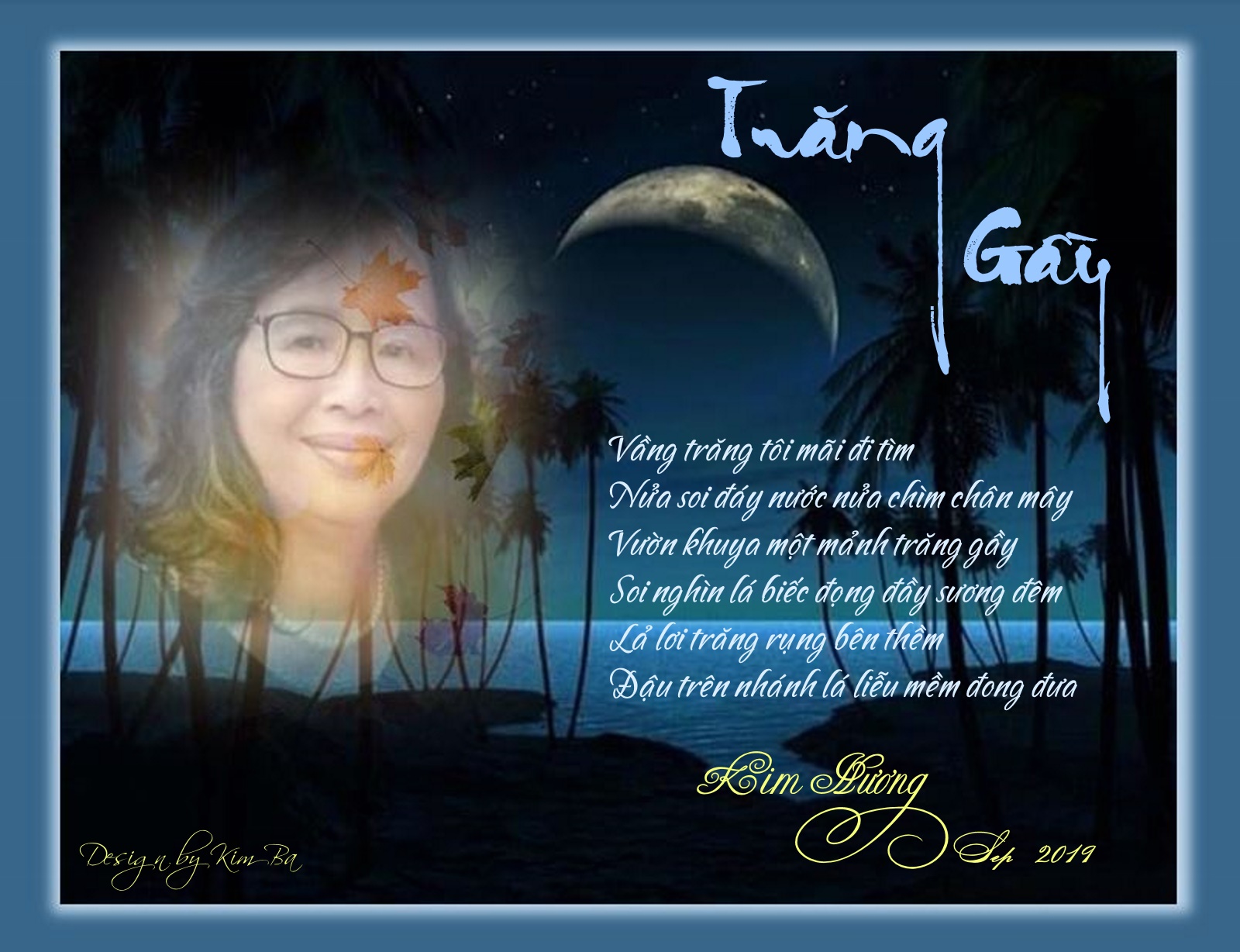Trăng Gầy Nửa Mảnh Trăng gầy nửa mảnh rụng làn trôi Nửa vút lên cao toả chiếu đồi Nước bể bồng bềnh đưa mấy cặp Trời mây lác đác dạt vài đôi Sương lơ lửng lấp vầng tan biến Khói mịt mù vây áng lặng rồi Bổng gió đêm tàn lên toả chiếu Trăng gầy nửa mảnh rụng làn trôi Cố Quận